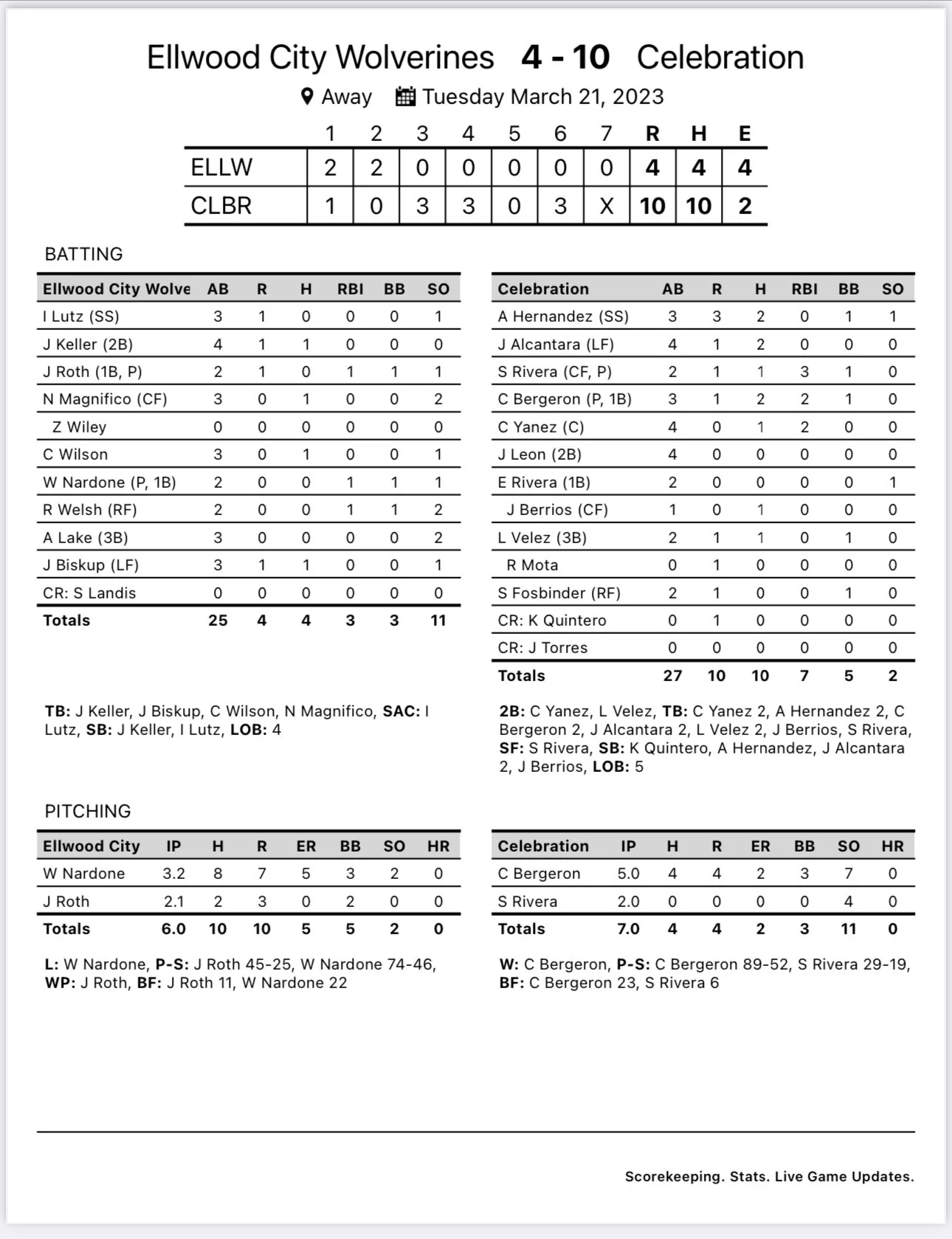 Jake Biskup, Jordan Keller, Chase Wilson, and Nick Magnifico all had one hit to lead Ellwood City Wolverines. Celebration racked up ten hits in the game. Javier Alcantara, Bergeron, and Alejandro Hernandez all collected multiple hits for Celebration.