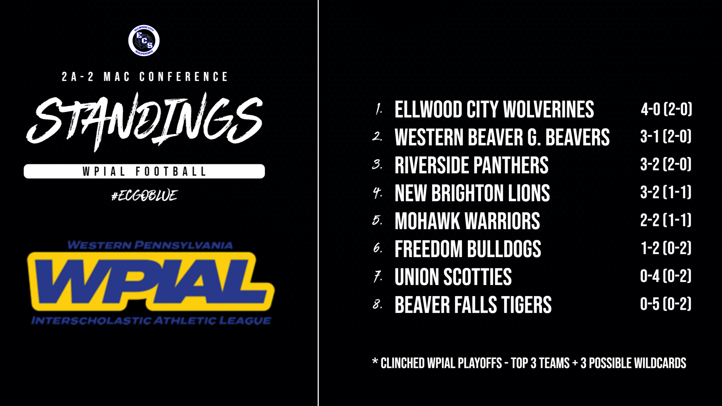 The Wolverines continued success breaks a record that was held in 1997 of winning four straight games to start the year. the 1997 team would finish 8-2 and lose to Brownsville 14-7 in the secound round of playoffs. Ellwood City will take their 4-0 (2-0) record back to Helling Stadium this Friday as they will host the New Brighton Lions 3-2 (1-1) in another MAC showdown. The game is EC’s Homecoming Night with kickoff slated for 7:00 PM and pregame festitivies starting at 6:30 PM for Homecoming. The game also marks the 2nd annual Blackout Night for the football team who will be wearing their alternate third jerseys. Go Wolverines!