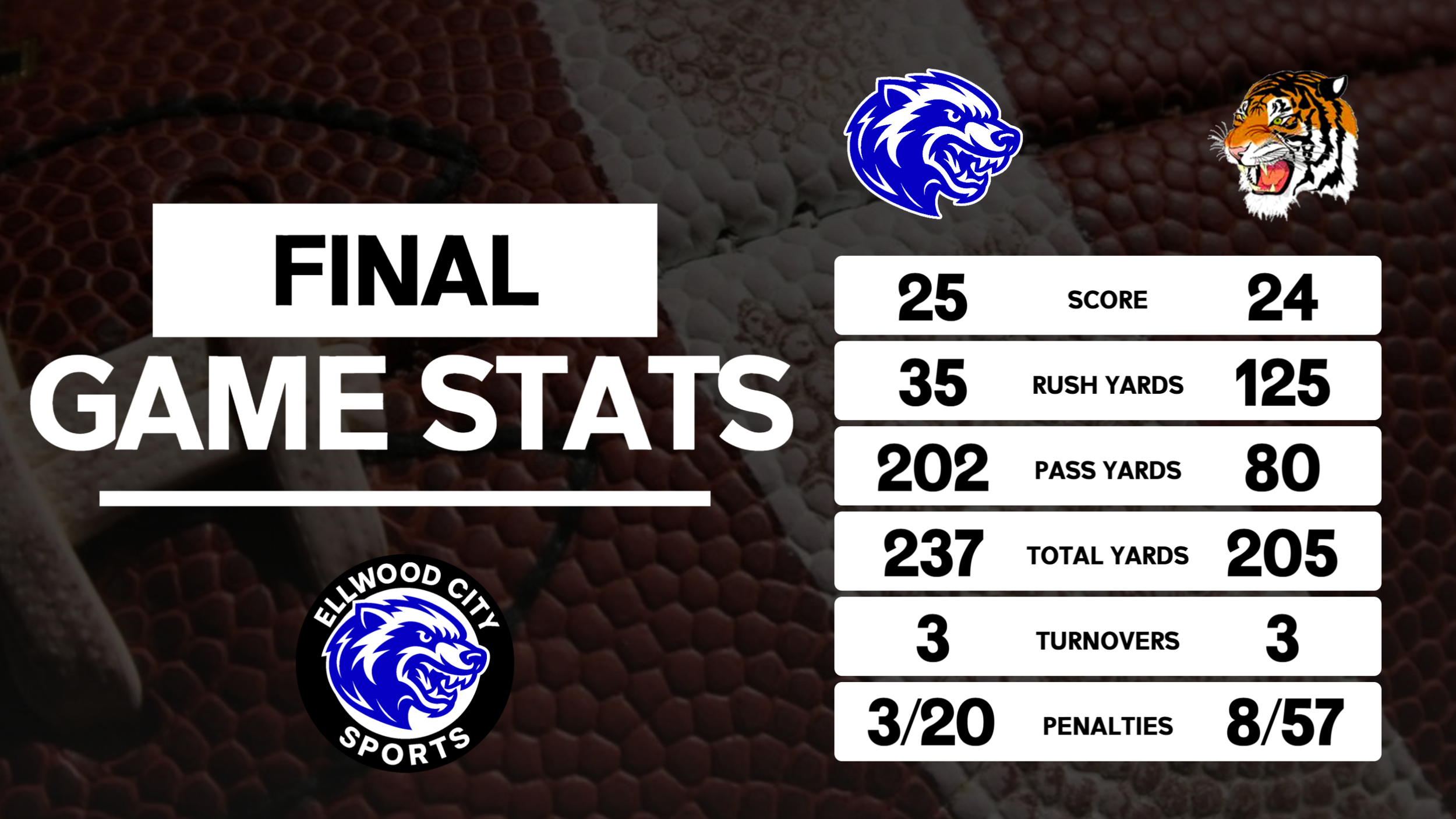 EC would finish the game flipping almost every stat category, except for the run game. EC would be outgained 125 to 35 in the run game, but would outgain the Tigers 202-80 in the pass game. The Wolverines would outgain the Tigers 237-205 on the night, holding the Tigers to just 76 yards in the second half. EC would also finish tied in the turnover category (3-3) after being down 2-0 in the category in the early going.