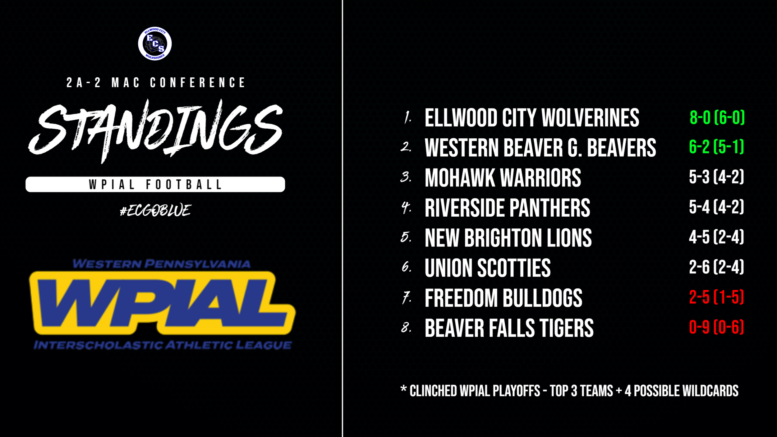 The Wolverines now 8-0 (6-0) clinch at least a share of the MAC title, the first title for EC football since 1997. The Wolverines will look to close out the regular season taking on the Beaver Falls Tigers 0-9 (0-6) on Senior Night from Helling Stadium. Kickoff is slated for 7:00 PM while Senior Night coverage begins at 6:30 PM via ECS live stream.