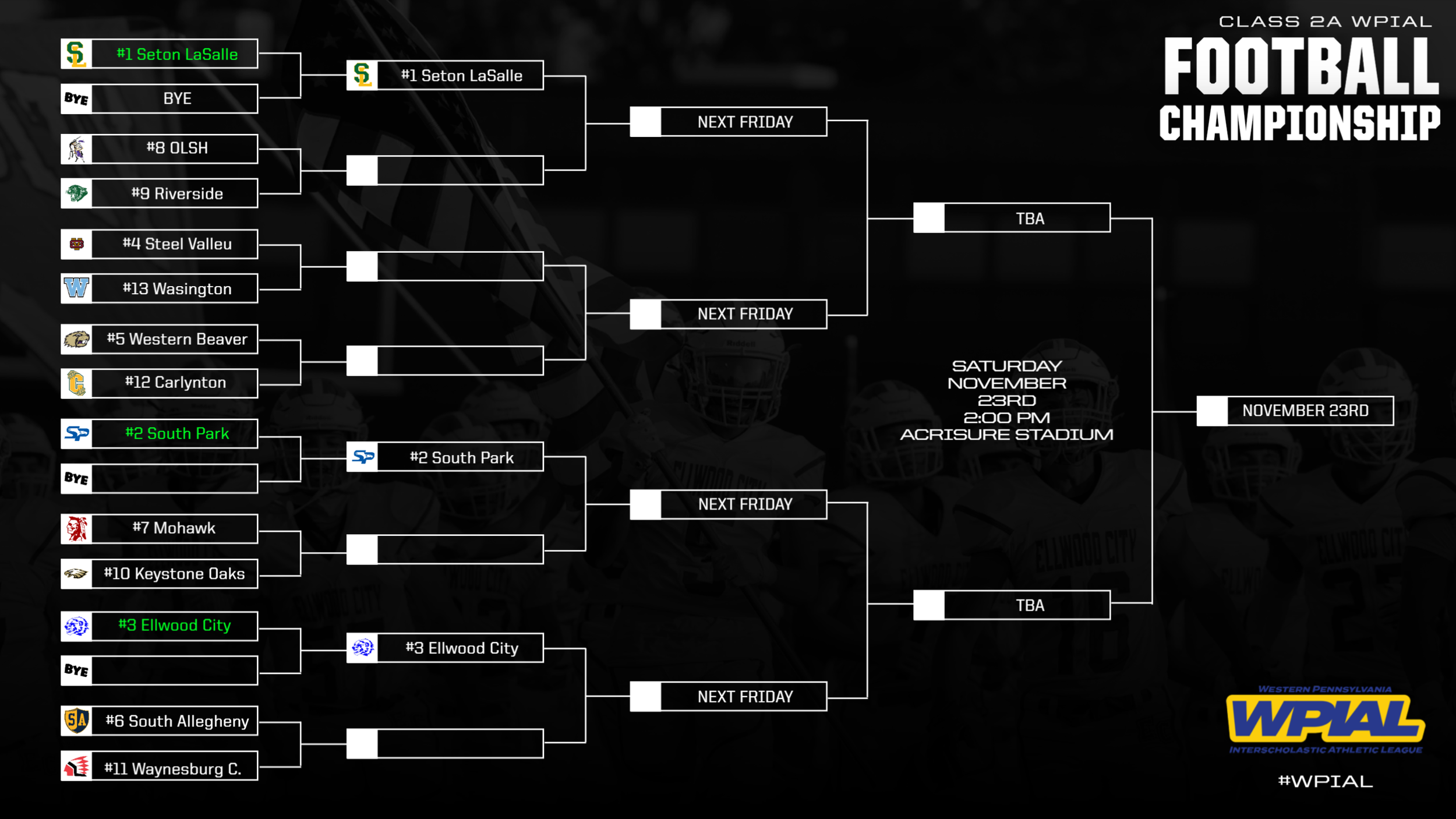 The Wolverines win the Midwestern Athletic Conference outright with a final record of 9-0 (7-0) and earned the #3 seed in this year’s WPIAL 2A Football Playoffs that begin on Friday. EC will have a first round bye and will take on the winner of the #6 South Allegheny - #11 Waynesburg Central matchup this Friday (SA and WC had an early season scrimmage against each other). The Wolverines will host the winner next Friday at 7:00 PM from Helling stadium. Congratulations to the Seniors, the players, the coaches, the parents, and to the ENTIRE EC community. WHY NOT ELLWOOD?!